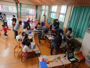 はじめは笑顔で見守っていた お父さんたちもウズウズしてきたようで(?) パソコンを覗き込み アドバイスしようとする姿も増えてきました(笑)